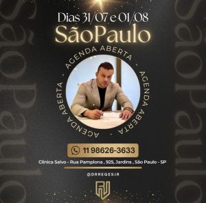 O renomado profissional da saúde, Dr. Reges, acaba de anunciar mais uma temporada de atendimentos em São Paulo. Com agenda aberta para os dias 31 de julho e 1º de agosto, o especialista estará recebendo pacientes na Clínica Salvo, localizada na Rua Pamplona, 925, no bairro Jardins — uma das regiões mais sofisticadas da capital paulista.